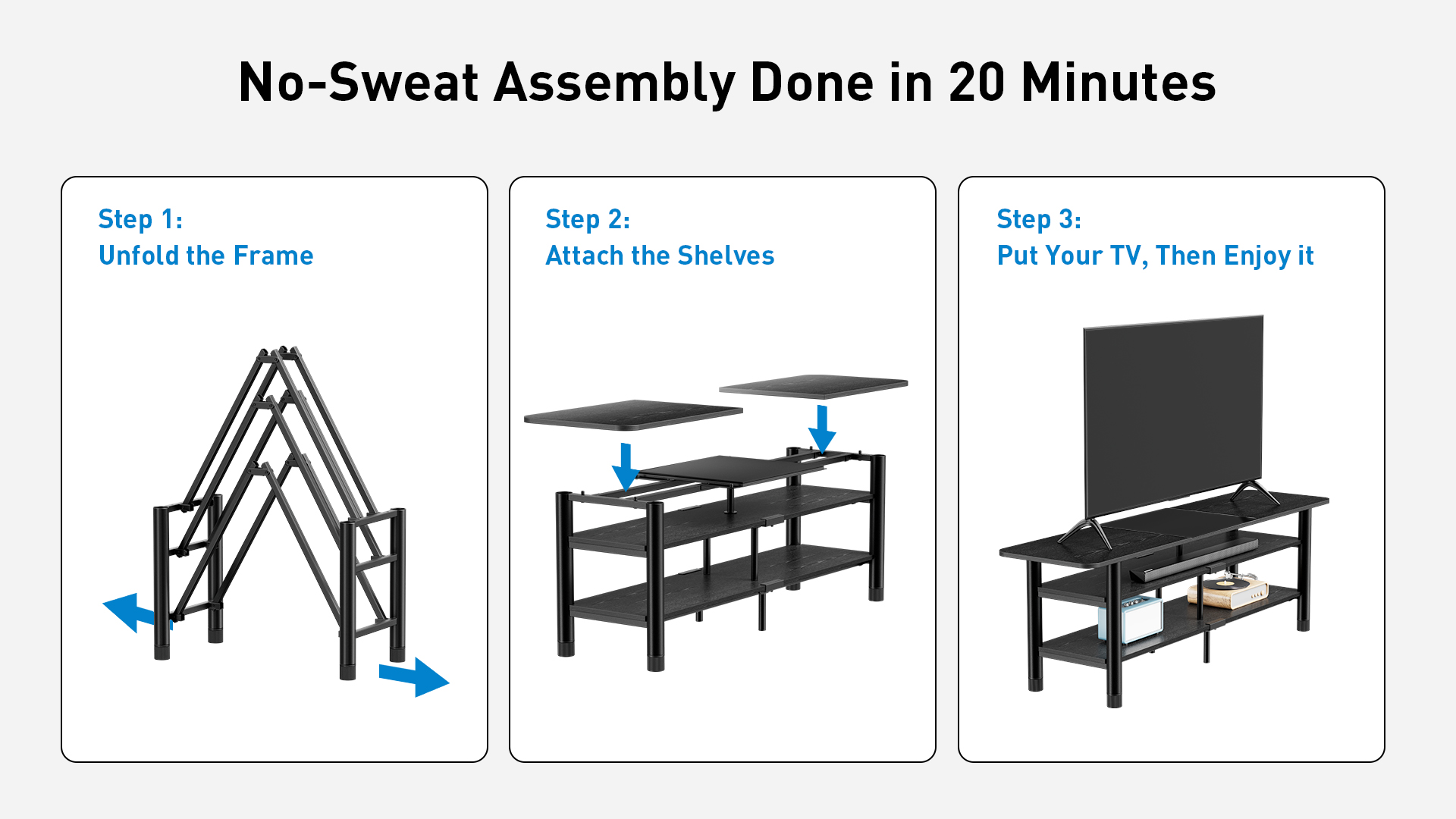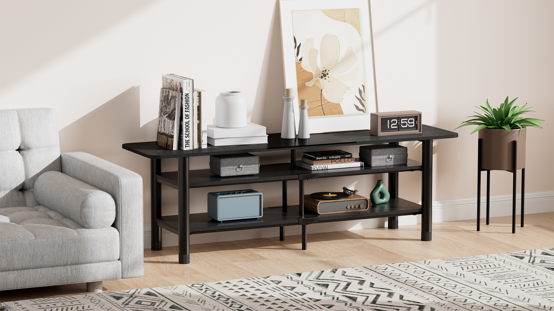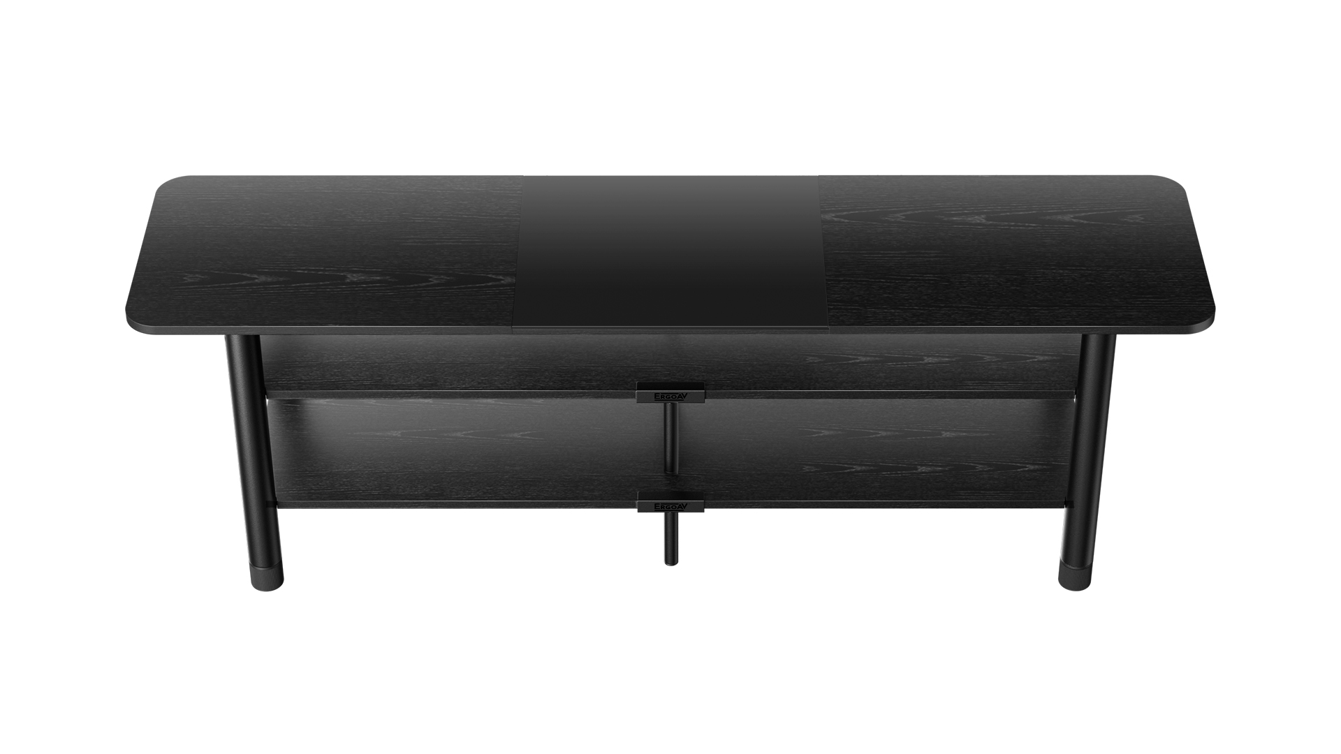 The ERTFL1-01B is 60” wide with a sturdy yet flexible frame to accommodate TVs up to 75”. This furniture piece has the frame pre-assembled, so you don’t have to. The pre-assembled frame allows for a less than 20-minute install. The black wood grain finish compliments today’s TVs and components. FlexFold consists of a tempered glass piece that is frosted which reduces fingerprints, and it’s sturdy and reduces the glare from the sun or your TV. Open architecture with MDF shelves and steel frame design keeps your equipment cool while providing easy access. Adjustable feet allow for the furniture to be leveled after assembly even if your floors aren’t perfect.