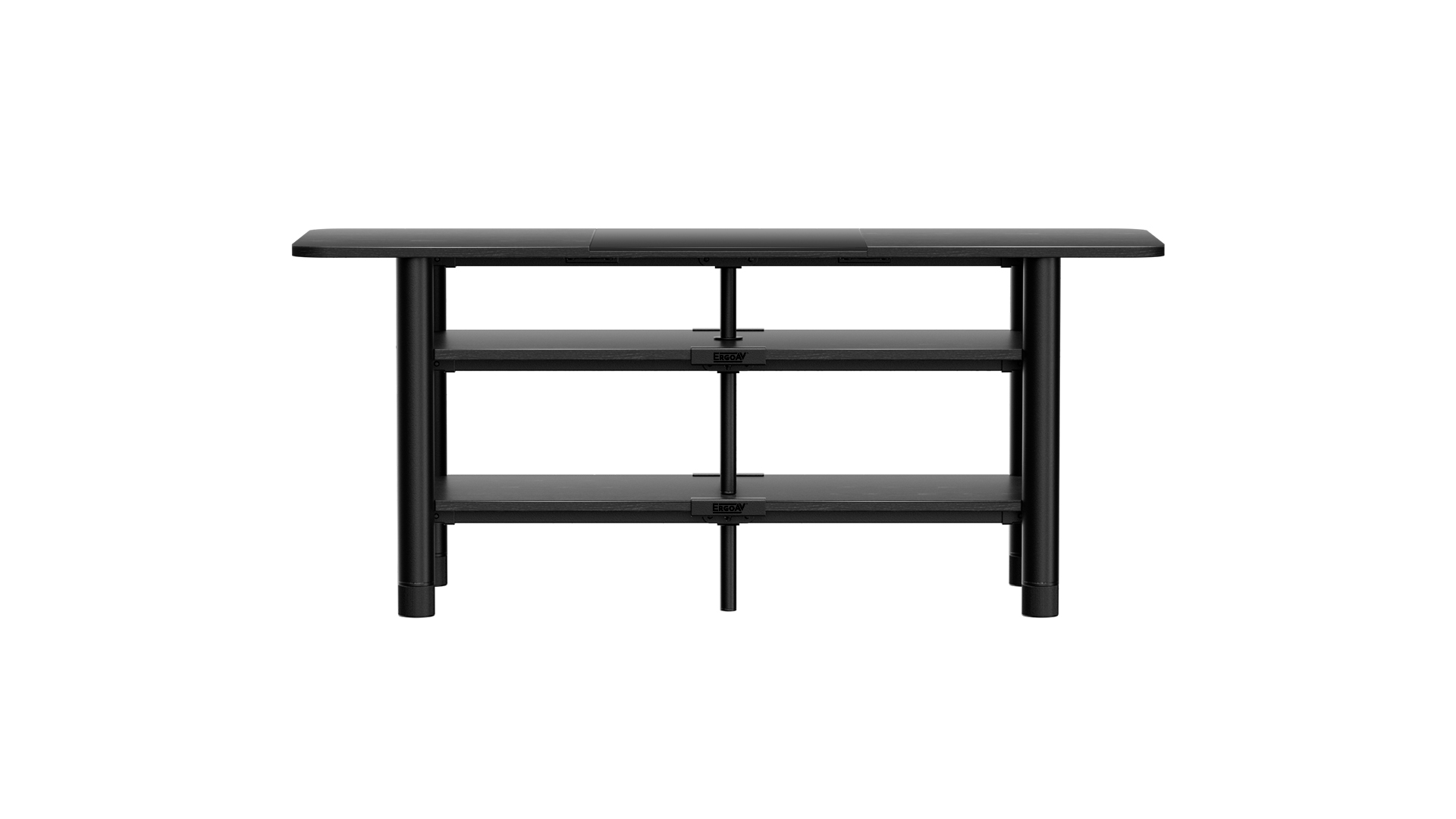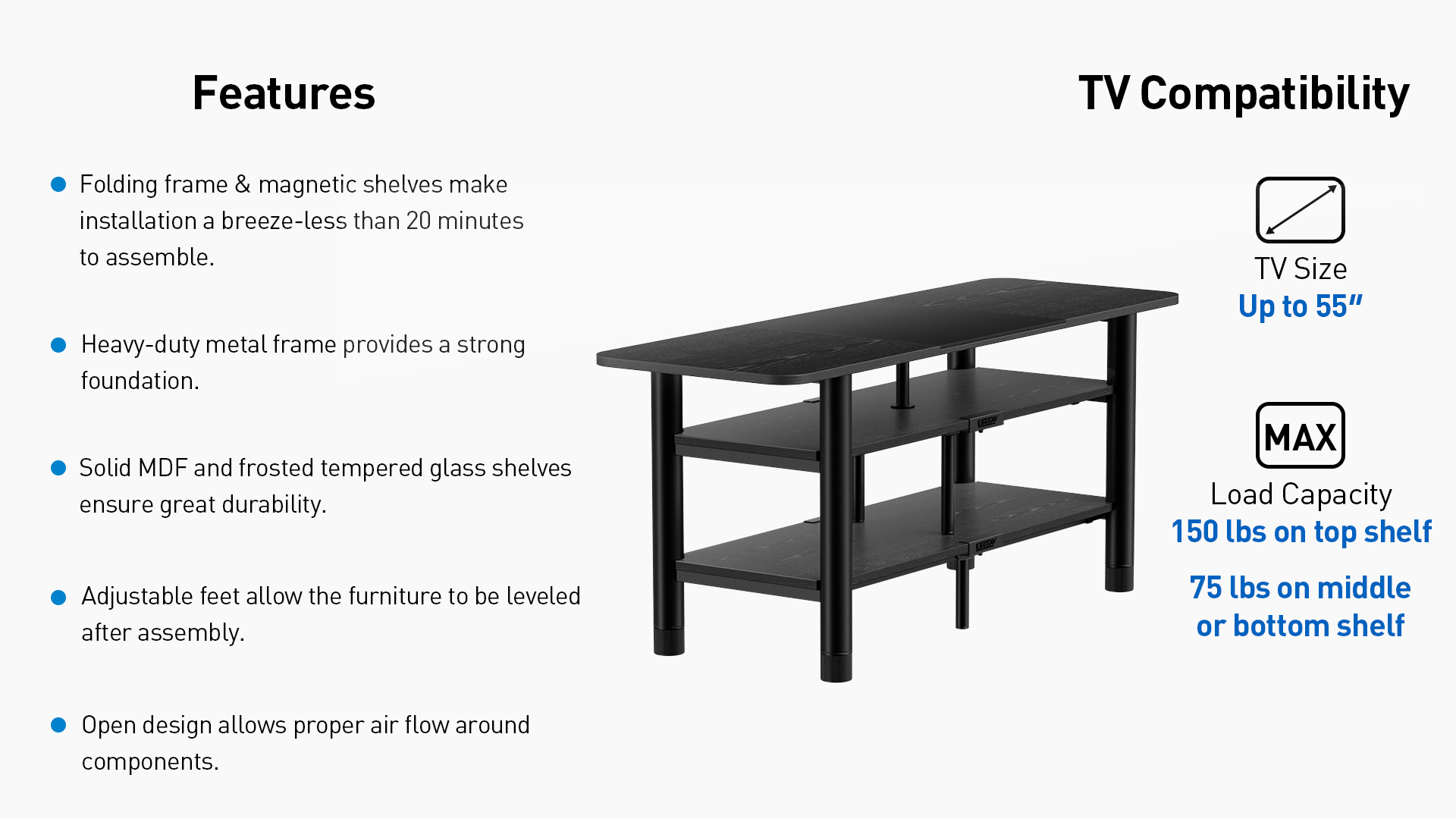 The ERTFS1-01B is 46” wide with a sturdy yet flexible frame to accommodate TVs up to 55”. This furniture piece has the frame pre-assembled, so you don’t have to. The pre-assembled frame allows for a less than 20-minute install. The black wood grain finish compliments today’s TVs and components. FlexFold consists of a tempered glass piece that is frosted which reduces fingerprints, and it’s sturdy and reduces the glare from the sun or your TV. Open architecture with MDF shelves and steel frame design keeps your equipment cool while providing easy access. Adjustable feet allow for the furniture to be leveled after assembly even if your floors aren’t perfect.