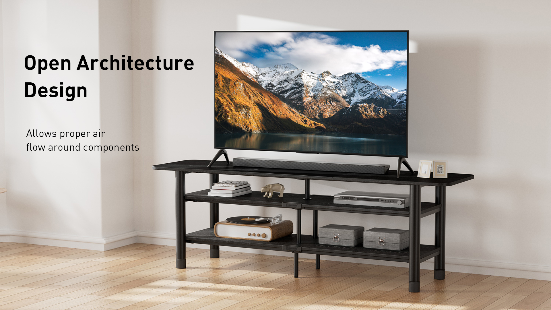 - Black wood grain finish compliments today’s TVs and components.