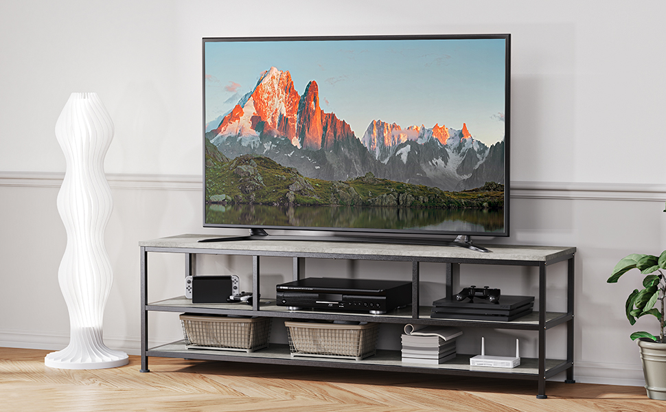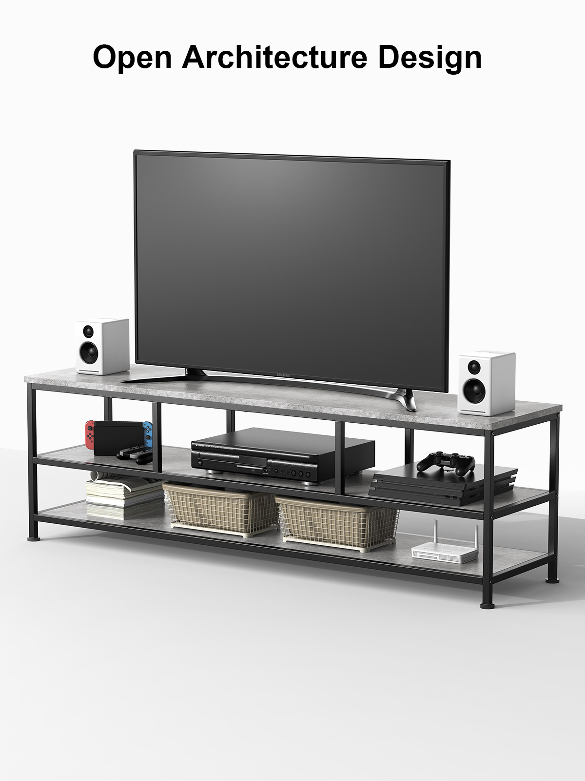 Small TV Stand with Black Metal Frame and Black Shelves