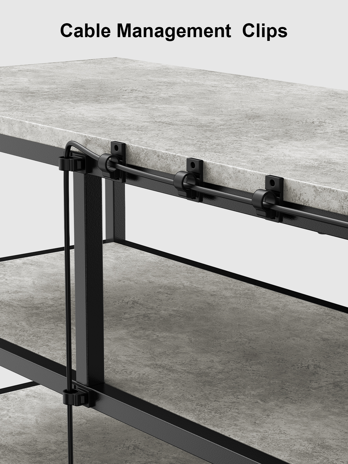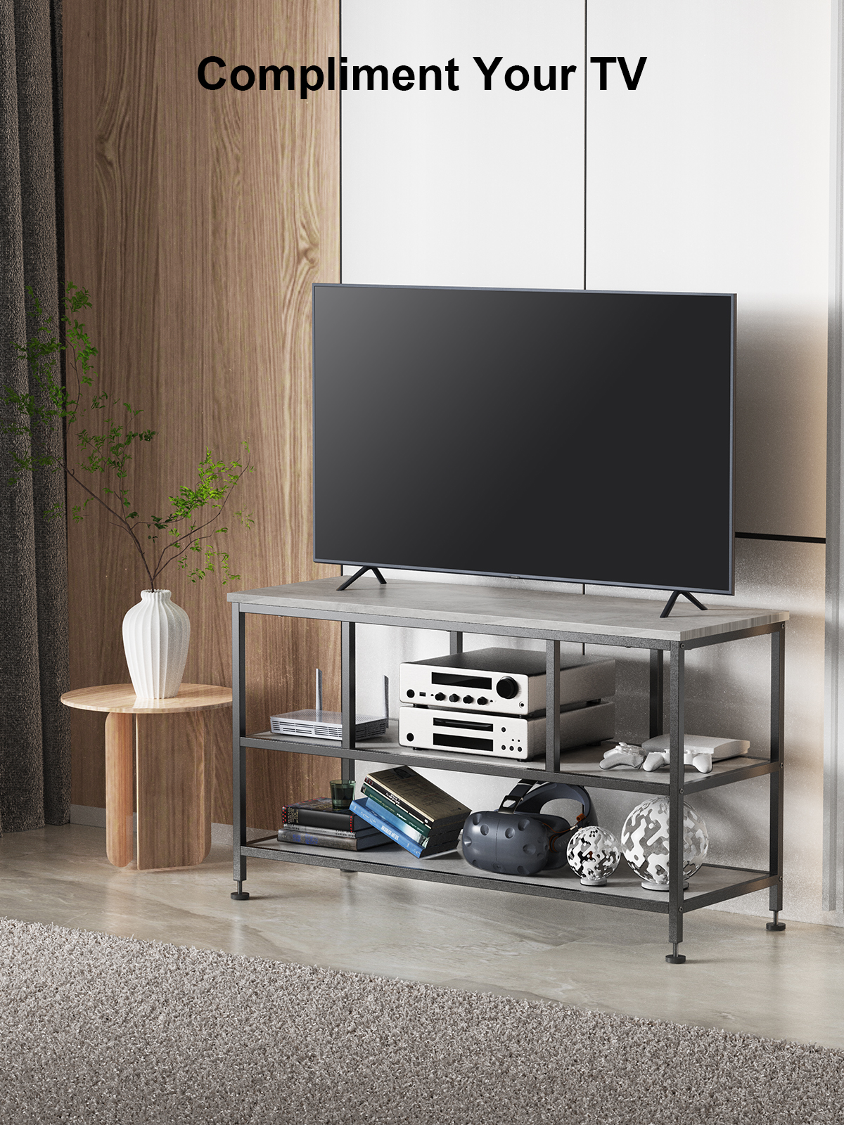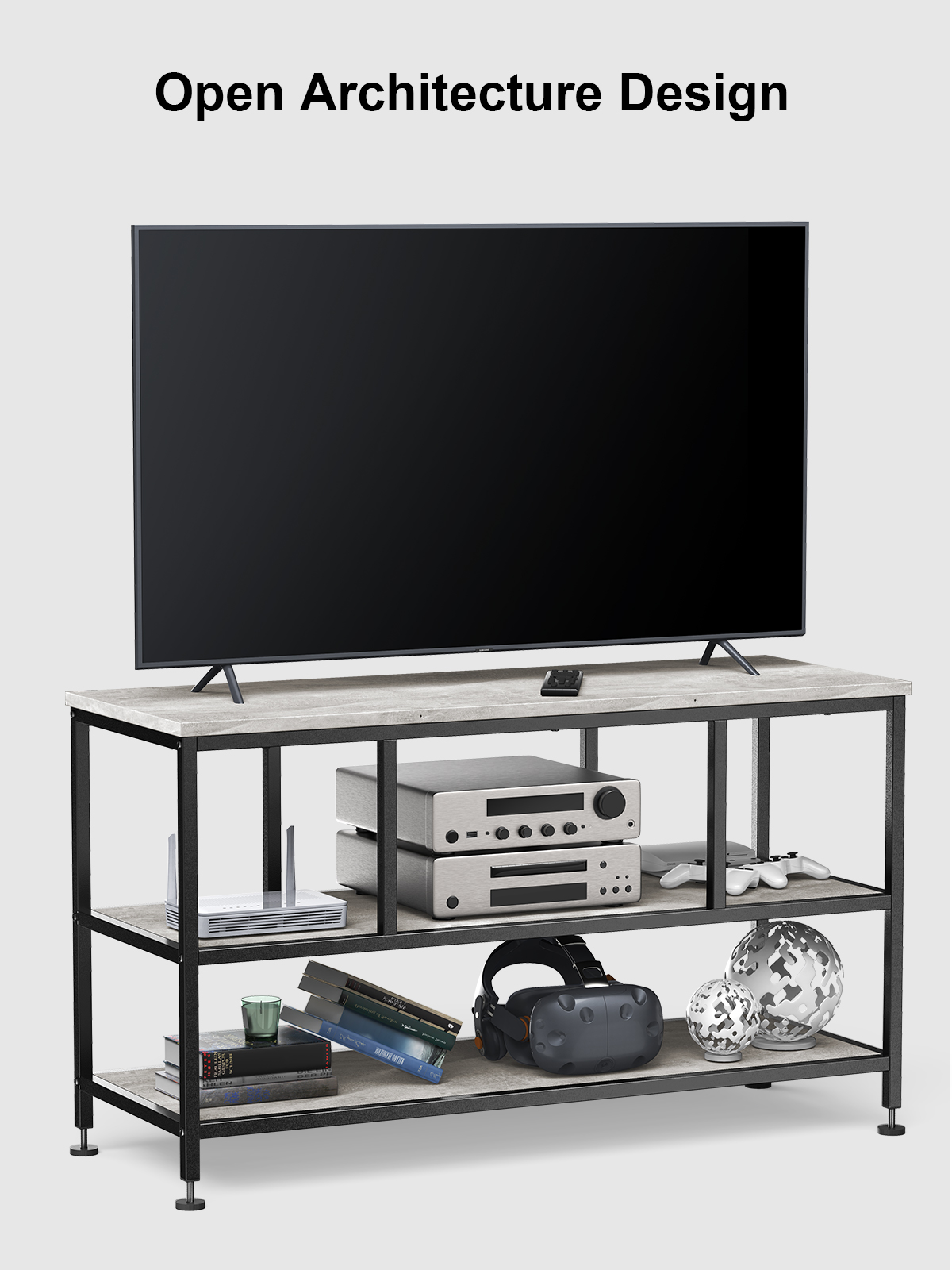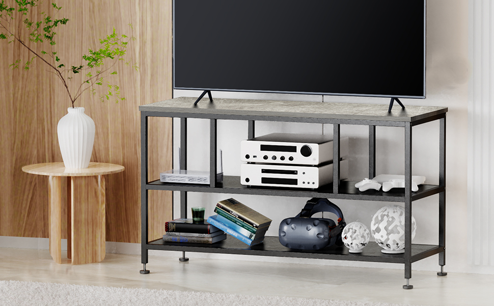 Large TV Stand with Black Metal Frame and Concrete Shelves