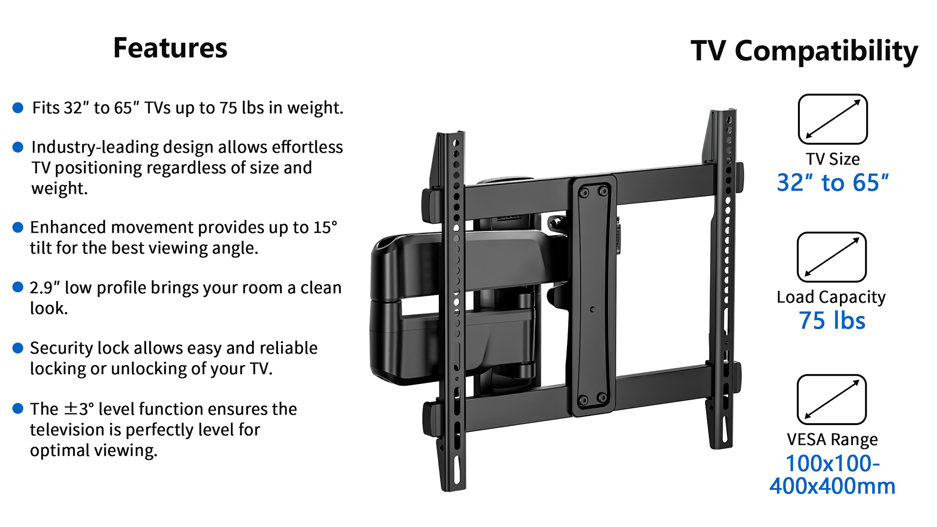 Motion Mount with Dual Arms for TVs 43″ to 75″